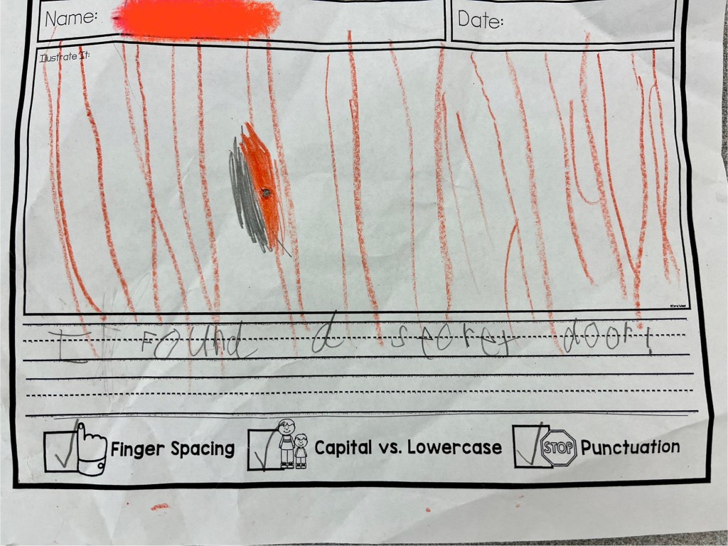 When he returned to school in the morning, I put his paper on his table and said that sometimes making a mistake leads to a new idea. I said I noticed the hole in his paper and wondered what it could be. Within a few minutes, he came up with the idea that it was a secret door and then wrote a sentence to go with his illustration.