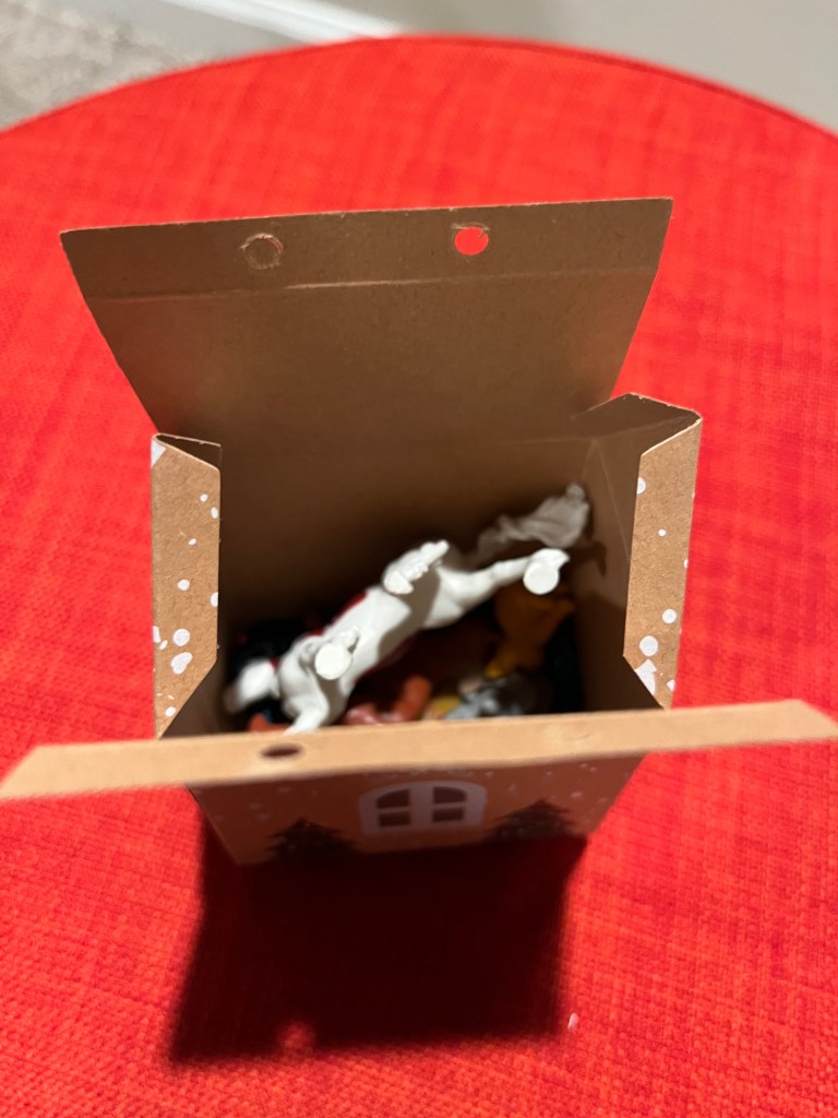 I start with a gingerbread treat box and add a small butterfly clip on top to make it easy for little hands to open and close independently. I fill the box with storytelling props. The great thing about traditional tales is that you can create your own version with whatever props you can find. Here are my favorite characters and additions.: a cat, a dog, a horse, a dinosaur (my fox), a gingerbread man, and a piece of blue fabric for the river.